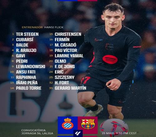 ![]() 体育资讯5月15日报道 北京时间5月16日3点30,西甲第36轮,巴萨客战西班牙人,巴萨公布本场比赛名单,费兰因阑尾炎手术缺席,球队取胜即可夺得本赛季西甲冠军。 附巴萨vs西班牙人名单: 门将:1-特尔施特根、13-佩尼亚、25-什琴斯尼 后卫:2-库巴西、3-巴尔德、4-阿劳霍、15-克里斯滕森、24-埃里克-加西亚、32-福特、35-杰拉德-马丁 中场:6-加维、8-佩德里、16-费尔明、17-卡萨多、20-奥尔莫、21-德容 前锋:9-莱万、10-法蒂、11-拉菲尼亚、14-托雷、18-保-维克托、19-亚马尔 |