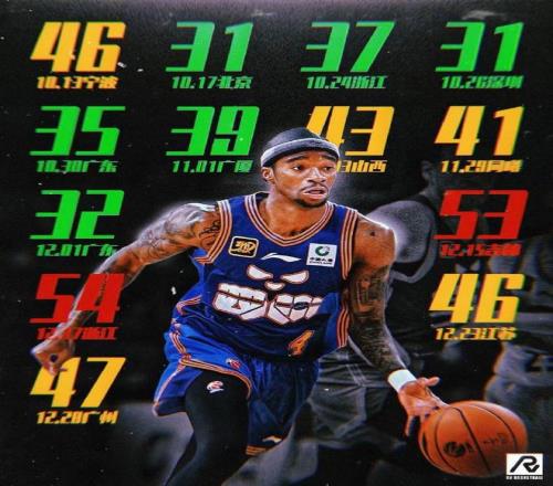 而且他是从开季第1场爆炸到了出战的最后1场,当时新赛季第1场,萨姆纳上来就抡了个46分,已经很恐怖了。前19场比赛里13场得分超过30+,有6场40+,还有2场50+,把各个球队打得是闻风丧胆。那两场50分还是背靠背的,先打吉林53+9+9,再打浙江54+10+7,两场比赛拿107分19板16助,这是什么无敌表现?真是战神。